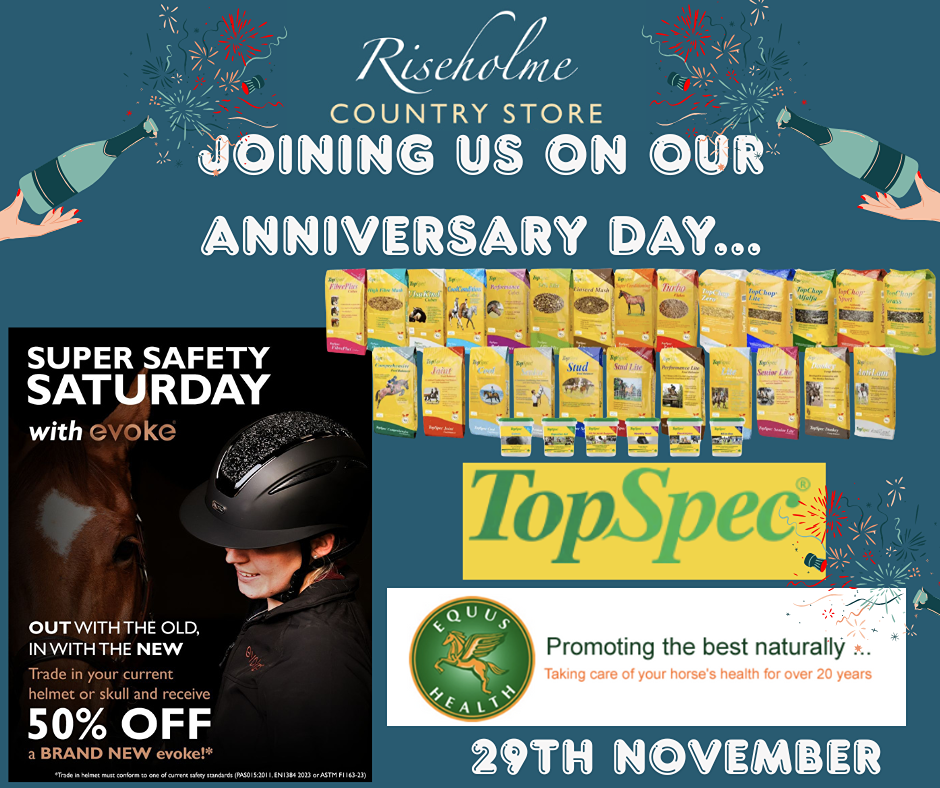 As well as Anniversary cake, mince pies and some very exciting Raffle Prizes, we are joined by Laura from TopSpec and Julie from Equus Health with great advice and offers on the day! Not only that, Evoke will be here with their 'OUT WITH THE OLD IN WITH THE NEW' offer which gives you the opportunity to replace your old helmet, which must conform to one of the current safety standards, with a brand new Evoke helmet at HALF PRICE!